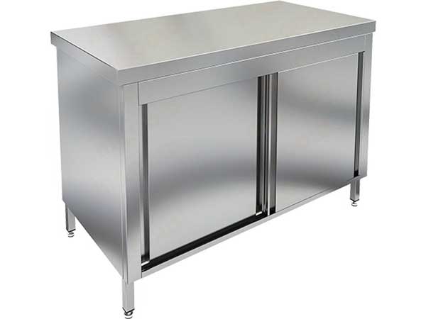 Стол-тумба изготовлена целиком из нержавеющей стали и предназначена для хранения пищевых продуктов, напитков, а также для приготовления пищи. Дверки имеют раздвижной принцип типа купе.
