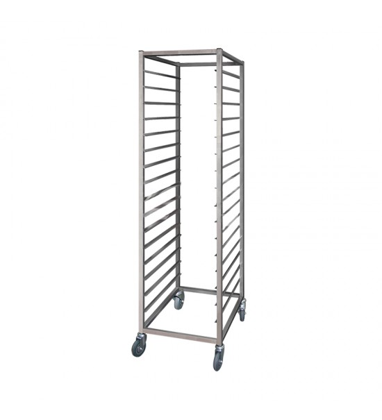 Шпилька на колесах из нержавеющей стали марки AISI 430, 12 уровней для 12 противней (600х400), каркас труба 25х25, направляющие изготовлены из листовой нержавеющей стали, колесные опоры диаметром 75 мм колеса, 2 с тормозом.